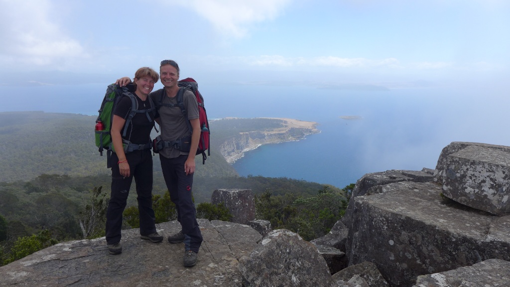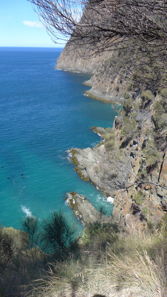 Am zweiten Tag haben wir eine etwas anstrengendere Wanderung zu einem Gipfel (Bishop & Clerk) unternommen. Zwar ist er nur ca. 650m hoch aber dafür fängt man ja auch bei 0 an. Die letzten Meter hieß es dann auch noch klettern und oben angekommen war die Aussicht überragend…….. schlecht :-), praktisch gleich Null, wir standen mitten in den Wolken. Der Gipfel ist dank der Lage und der Meeresströmungen die meiste Zeit in Wolken gehüllt, da heisst es sich hinsetzen und warten, denn wenn es aufreisst dann ist die Aussicht wirklich genial. Der Abstieg, bzw. weitere Weg führte uns über die sognannten „Fossil Cliffs“, die Klippen hier bestehen zum größten Teil aus Fossilien.