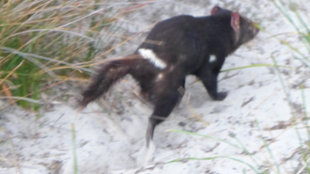 Nachdem wir erfahren haben das hier einige tasmanische Teufel vorkommen haben wir uns abends, mit Kamera bewaffnet, auf die Jagd gemacht. Und tatsächlich wir haben es geschafft und nicht nur einen gesehen sondern auch ein Beweisfoto machen können. Wie wir von einigen Australien erfahren haben dürfen wir uns glücklich schätzen. Ein Feuerwehrmann aus Hobart meinte er hätte in 40 Jahren noch keinen gesehen. Allerdings haben wir ja in Deutschland auch noch nie einen Wolf, Luchs oder eine Wildkatze in freier Laufbahn gesehen, was wohl ähnlich selten der Fall sein dürfte.